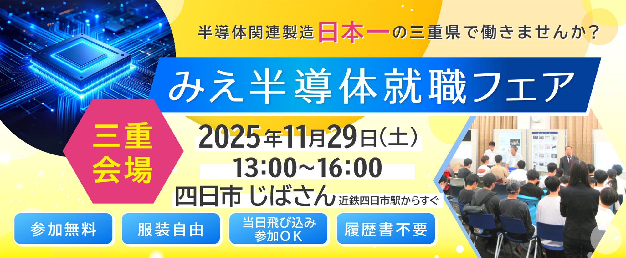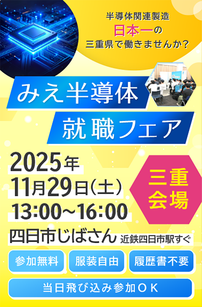 業界大手を含む三重県内の半導体関連企業が一堂に集結するまたとない就職フェアです!半導体業界の最前線で活躍する企業と個別ブースで直接対話できるチャンス。迷う時間はもったいない!半導体業界への最短ルートがここにあります。